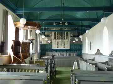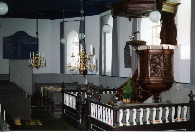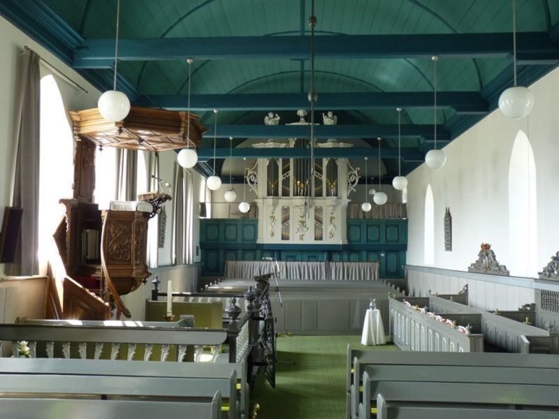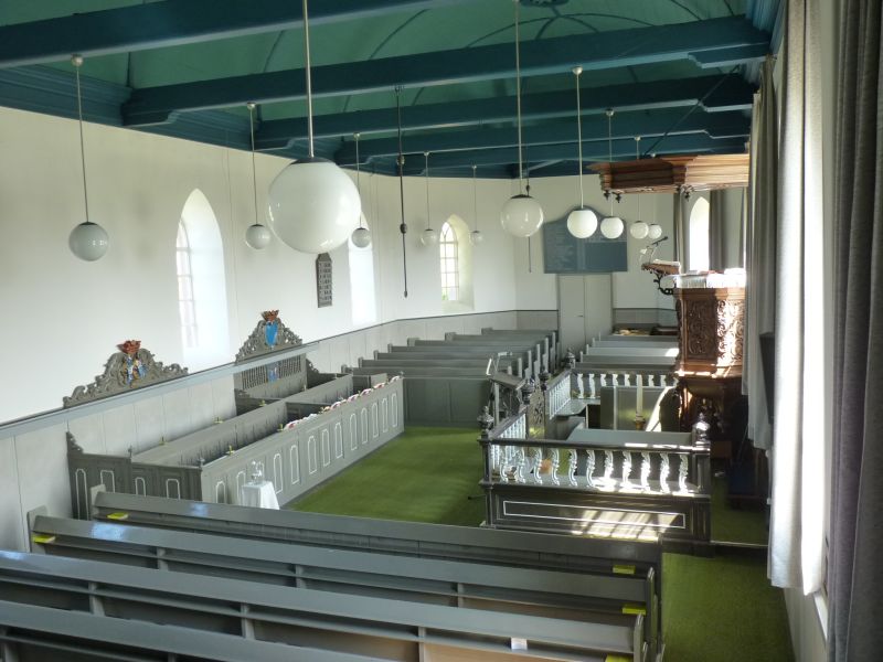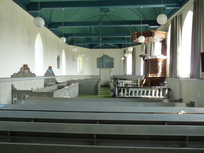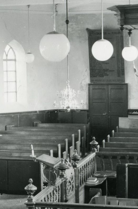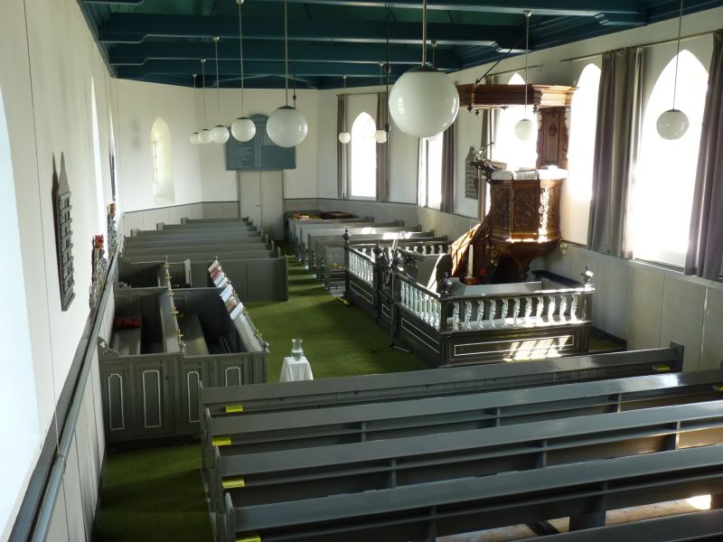 Aan de ingangspartij onder het orgel is nog goed te zien dat oorspronkelijk de zitplaatsen in het schip in twee rijen waren opgesteld; bij de vernieuwing van 1935 is dat veranderd in de huidige opstelling. Ook de herenbanken (voorheen in het koor van de kerk) werden toen verplaatst. Een gedenkteken in de zuidmuur herinnert er nog aan: