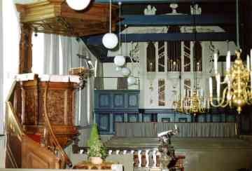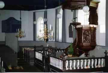 De preekstoel stamt uit de 18e eeuw en is waarschijnlijk gemaakt door de Dokkumer houtsnijwerker Yge Rintjes. Rond 1770 heeft deze in meerdere dorpen in de omgeving sterk op elkaar gelijkende kansels gemaakt. De kansel heeft als bijzonderheid twee versierde trapleuningen, waar één versierde leuning gebruikelijk is. De hoekversiering van de kuip bestaat uit vruchten, bladeren en bloemen, terwijl de panelen eveneens ingelegd zijn met deze voorwerpen. Dit alles in rococo stijl. Het voorste paneel heeft tevens een voorstelling van een adelaar, het symbool voor de Evangelist Johannes. Onder de panelen loopt een nu lege banderol waarop nog wel te zien is dat er letters hebben gestaan. Op de meest rechtse is met enige fantasie nog ‘Nieukerkes’ te zien, maar waarschijnlijk staat er ‘Lieuwe Sipkes’. Duidelijkheid hier omtrent is niet te verkrijgen aangezien de Kerkboeken (de boeken van de kerkvoogdij) pas na 1825 beginnen.