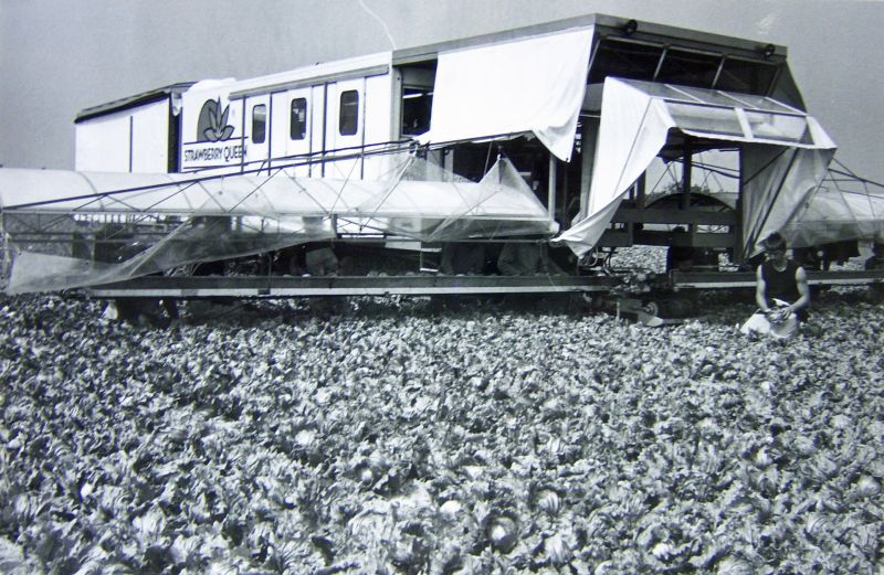 Betekende voorheen het oogsten van veel koolsoorten het voortkruipen van de stugge werkers over het veld en het meeslepen van kratten, op de foto is een gemechaniseerde vorm van de broccoli-oogst te zien.