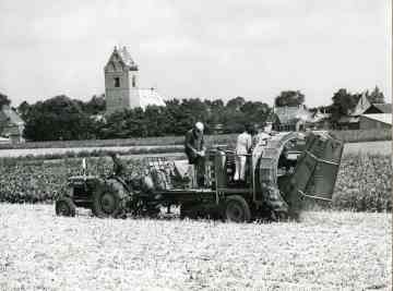 Op het tweede perceel achter De Lyts Ein, dicht tegen de Dongerawei aan, wordt driftig gerooid. Op de wagen vult Andries Brouwer de zakken, een aantal jeugdigen sorteert de door de machine opgewerkte aardappelen. De chauffeur (met alpino-pet) stuurt onverstoorbaar de Masey Ferguson over het veld.