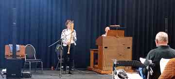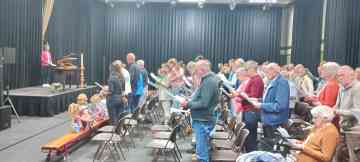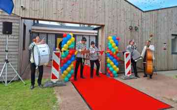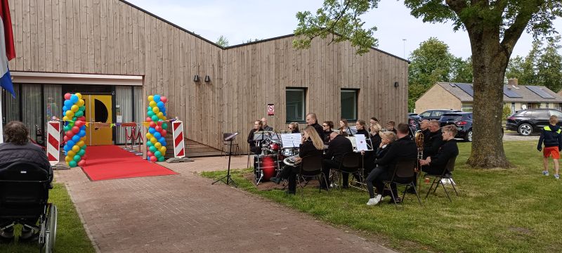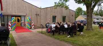 Dorpsgenoten en gasten worden buiten ontvangen met muziek van Brassband UDI.