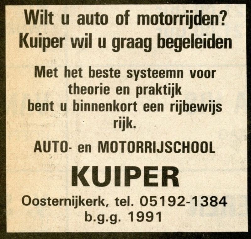 Tijdens het rijexamen zat ik bijna altijd achterin; ik wilde weten hoe het ging. Soms was ik het niet eens met de examinator en dat zei ik ook. Ja, ik heb zelfs een examinator bij zijn stropdas gepakt, die wilde beweren dat ik er geen verstand van had. En dat na al die jaren ervaring en goede resultaten, ik durf te zeggen dat Autorijschool Kuiper van Easternijtsjerk mede aan kop stond in Ljouwert! Dat mannetje was zo’n Hollander van de overkant van de Afsluitdijk, die de Friezen even zou laten zien hoe examens moesten worden afgenomen. Hij liep blauw aan en de man is nooit meer in Leeuwarden geweest om examens af te nemen.