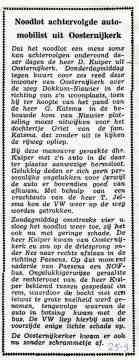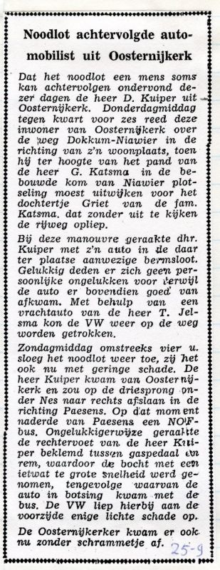 Ik heb twee maal tegen mensen gezegd dat ze er beter mee konden stoppen, want zij zouden het nooit leren. Ik wilde zulke mensen niet aan het lijntje houden. Er waren rijscholen die dat wel deden. Ik weet dat er één geslaagd is, maar dat heeft toch zeker nog een koe gekost. Gelukkig heb ik tijdens de rijlessen geen ernstige ongelukken gehad. Meestal reed ik eerst een rondje door de omgeving en ging dan pas met zo’n leerling naar Leeuwarden. Eén keer ging dat wat anders. Willem van Peazens was zover dat hij naar Leeuwarden kon gaan, maar ik wist niet wie daar met hem moest rijden. Ik dacht dat Jantsje het was, maar die had nog niet gereden. Ze zag het eerst niet zitten, maar ik vertelde haar dat ik met de dubbele bediening net zo goed op mijn eigen plek kon rijden als achter het stuur en dat het dan maar moest gebeuren. Midden in Leeuwarden nam Jantsje het stuur over van Willem en het viel haar niet tegen. "Maar ik vertrouwde ook helemaal op jou”, zei ze.