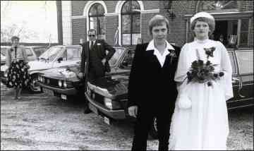 1982, 15 januari, trouwdag van Wiebe en Antsje Kuiper bij het gemeentehuis in Mitselwier. Autorijschool Kuiper had toen drie lesauto’s op de weg, de grote L is duidelijk op de auto’s te zien. Links staat Hillie, dan Douwe en vooraan het bruidspaar.