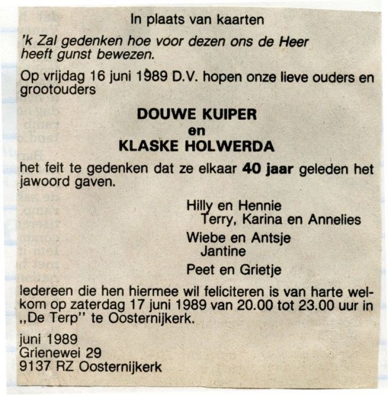 Zo kwam Coster in 1963 naar de boerderij aan de Langgrousterwei, maar Douwe en Klaske hadden toen geen huis meer! We hebben eerst een tijdje bij mem in Moddergat gewoond, maar dat was geen succes. Wij hebben twee kinderen en dat valt bij oudere mensen niet altijd in goede aarde; kinderen rennen en draven graag rond, laten deuren open staan, maken rommel en lawaai en ga zo maar door. Toen konden we naar een zuster van Klaske in Emmeloord en daar bleven we een tijd.