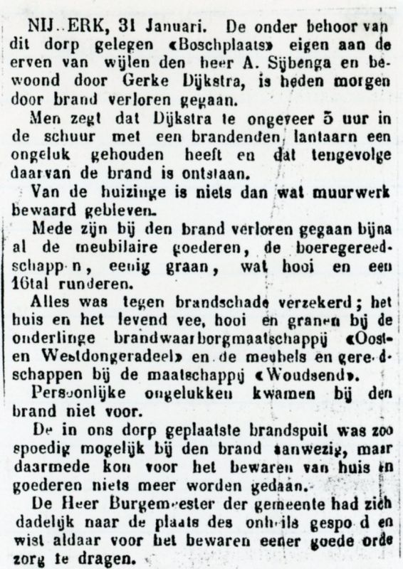In 1893 trof de Boschplaats een grote ramp toen de boerderij in brand vloog. Hoewel de boer verzekerd was, werd de boerderij kleiner opgebouwd en ontstond het karakteristieke kop-romp-model.
