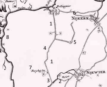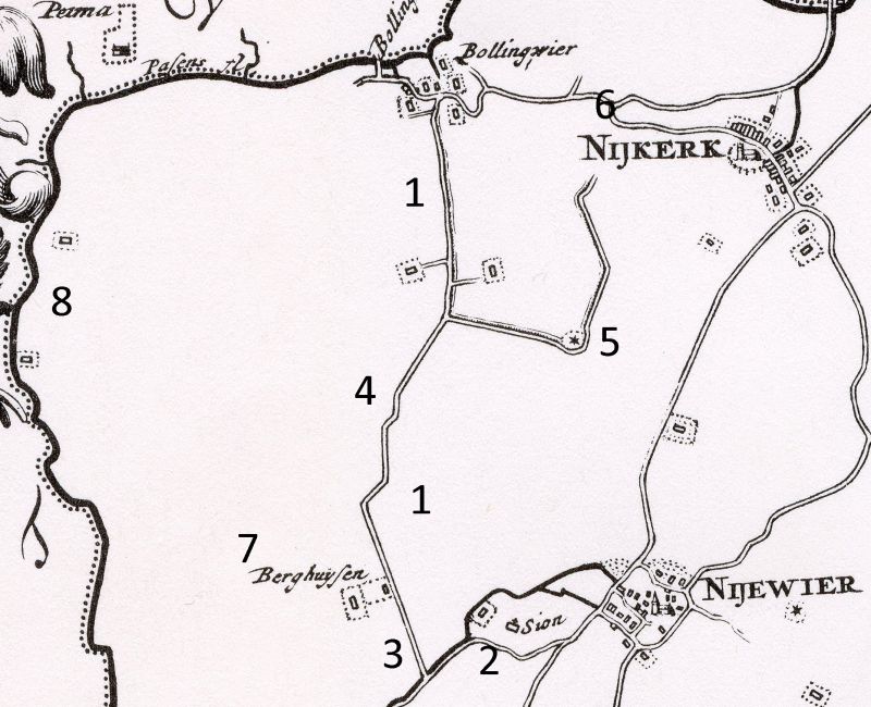 De nummers bij het kaartje (n.a.v. Schotanus 1718) betekenen:
