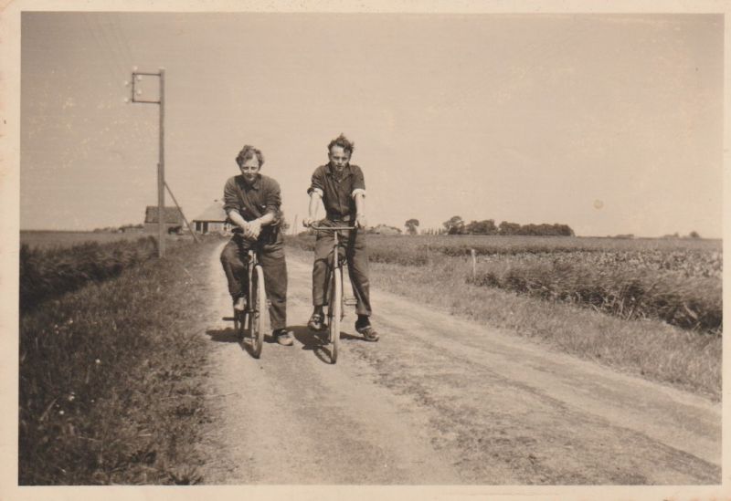 De broers Pieter (rechts) en Sape Sikkema met rechts op de achtergrond Bollingwier en links het door de familie destijds bewoonde boerderijtje dat in 1980 in brand vloog.