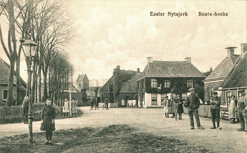 Dit is de oudst bekende foto van de Boate' Hoeke. Dit kruispunt wordt sinds jaar en dag de “Boate’ Hoeke” genoemd, de oorsprong van deze naam is onbekend, maar in 1853 was Bote Sapes Posthumus herbergier in het café op de hoek, misschien dat hij de naamgever is.