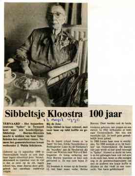 Sibbeltsje Kloostra werd in 1990 honderd jaar. Ook zij woonde de laatste jaren in De Spiker in Ternaard. Ze werd geboren in 1890, waar ze naar de christelijke school ging, maar wegens geldgebrek moest ze naar de openbare school. Ze trouwde met Feije Bierma en kregen een zoon en een dochter. Van 1922 tot 1986 woonde ze 'in de buorren' van Oosternijkerk.