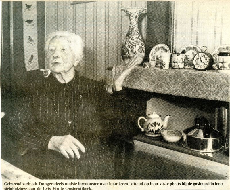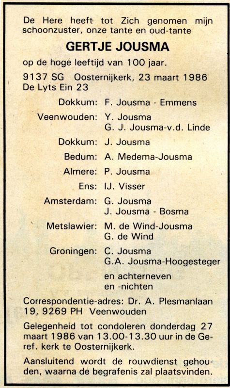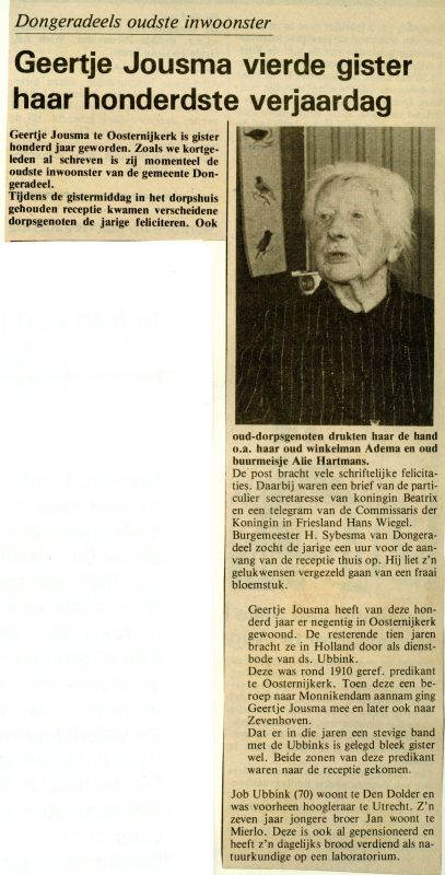 Geertje Jousma overleed in 1986 op de leeftijd van 100 jaar. Zij woonde aan De Lyts Ein 23. In de overlijdensadvertentie staat de naam Gertje Jousma. Ook zij was de ouste inwoonster van de gemeente. De jarige vierde dit in het dorpshuis met inwoners en zelfs oud-inwoners, met schriftelijke felicitaties van koningin Beatrix en Commissaris van de koningin Hans Wiegel. Ook burgemeester Sybesma kwam geluk wensen. Geertje Jousma woonde 90 jaar in ons dorp. Toen dominee Ubbink vertrok naar Monnikendam ging ze mee en later ook naar Zevenhoven.