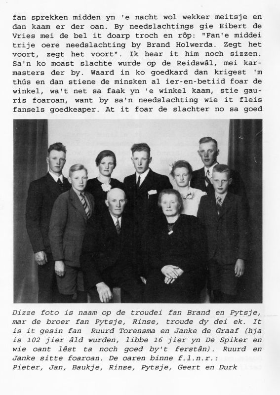 Janke de Graaf getrouwd met Ruurd Torensma werd 102 jaar oud, ze woonde de laatste 16 jaar in De Spiker in Ternaard, maar bleef helder bij het verstand. Ze hadden zeven kinderen, dochter Pytsje trouwde met Brand Holwerda, die een slagerij had aan de Buorren.