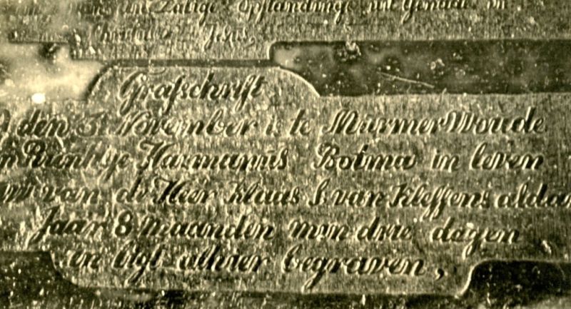 De enige grafzerk waarvan in 1935 een foto werd gemaakt, de grafzerk van Rienkje Botma, 1819.