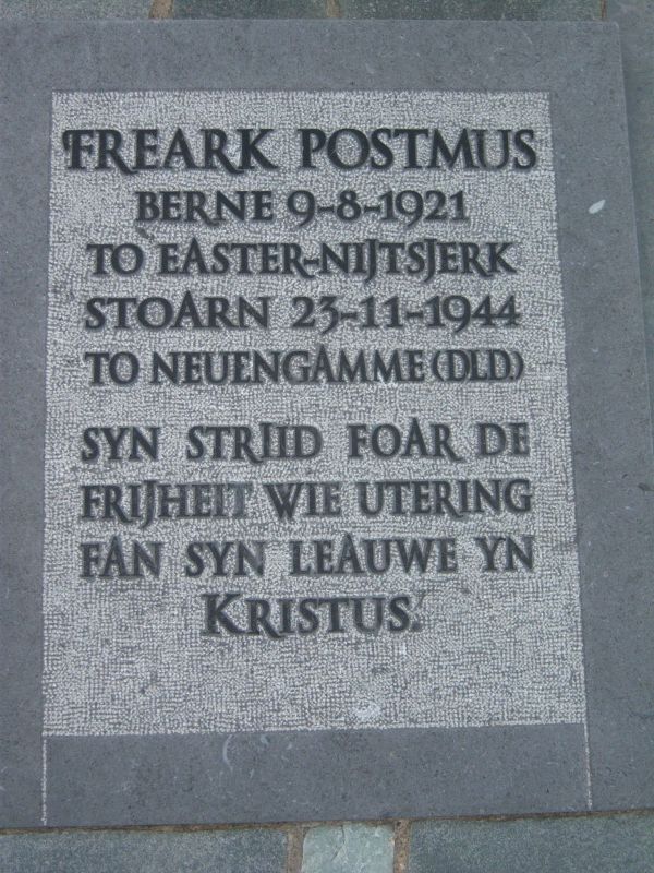 Dergelijke zuilen zijn bestemd voor personen die in het verzet zijn omgekomen. Deze zuil is bedoeld als herinnering aan het leven van Freerk Postmus, 1921-1944, omgekomen in concentratiekamp Neuengamme, vlak bij Hamburg in Duitsland. Freerk was al vroeg in de oorlog actief met het verspreiden van verzetskrantjes en moest na de Meistaking onderduiken. Hij ging naar familie in Overijssel en deed daarna verschillende keren mee aan overvallen op distributiekantoren en gemeentehuizen. Jong als hij was werd hij al (mede) leider van een knokploeg. Hij liep tegen de lamp toen hij een ‘besmet’ huis binnenging, zat in verschillende kampen in Nederland voor hij naar Neuengamme werd vervoerd waar hij op 23 november 1944 om het leven kwam.