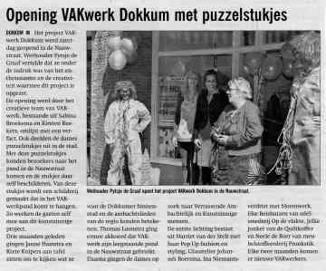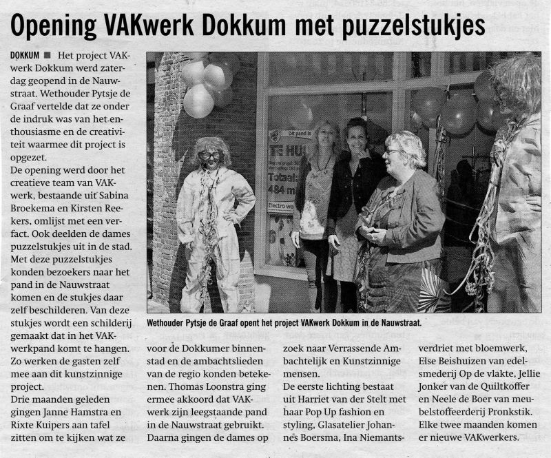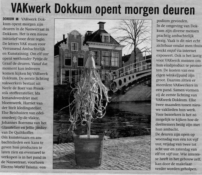 Vorig jaar kwam dit mede tot stand met behulp van subsidies van de Rabobank, dit jaar steunt de gemeente het project. Zoals gezegd zit zij nu, vanaf 1 juni 2013, samen met Neele de Boer van meubelstoffeerderij Pronkstik, en outlet de Friese Poort in de Nauwstraat 4, te Dokkum. Zij maakt daar de meest prachtige creaties en ontwerpen.