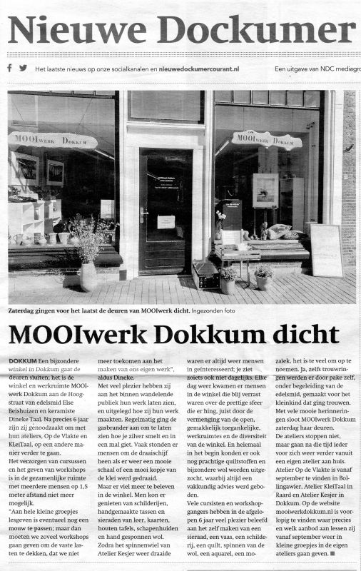 In coronatijd, met de lock-down in aantocht (augustus 2020) stopte MOOIwerk. Dineke ging verhuizen en kreeg een atelier thuis voor het pottenbakken. Een verstandig besluit om te stoppen, want cursussen en workshops konden niet worden gegeven en de winkels gingen dicht.