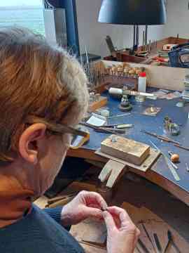 Prachtige ontwerpen laat ze zien, zoals de gouden ring met saffier steen en het zilveren doosje met bloemen erop, dat ze voor elk van haar kleinkinderen maakt (voor bijv. de eerste tandjes). Maar zo’n doosje zou ook gemaakt kunnen worden als asdoosje.