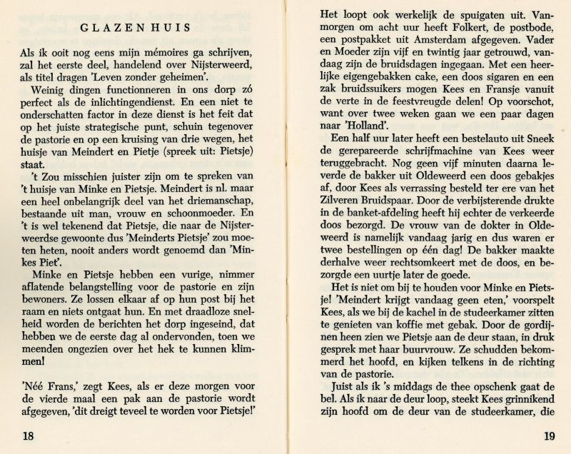 Hieronder is het hoofdstuk weergegeven waarin de pastorie als een ‘Glazen Huis’ wordt beschreven en de nieuwsgierigheid van sommige dorpsbewoners een hoofdrol speelt, maar dan op een humoristische manier verwerkt. Vooral een beginzin als ‘Als ik ooit nog eens mijn memoires ga schrijven, zal het eerste deel, handelend over Nijsterweerd, als titel dragen ‘Leven zonder geheimen’. In dat verhaal speelt de nieuwsgierigheid wel een hoofdrol, maar blijft de beschrijving luchtig en niet aanstoot gevend. Als het boekje nog ergens te krijgen is, is dat een aanrader!