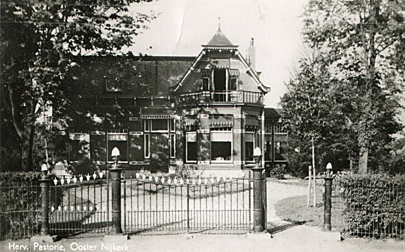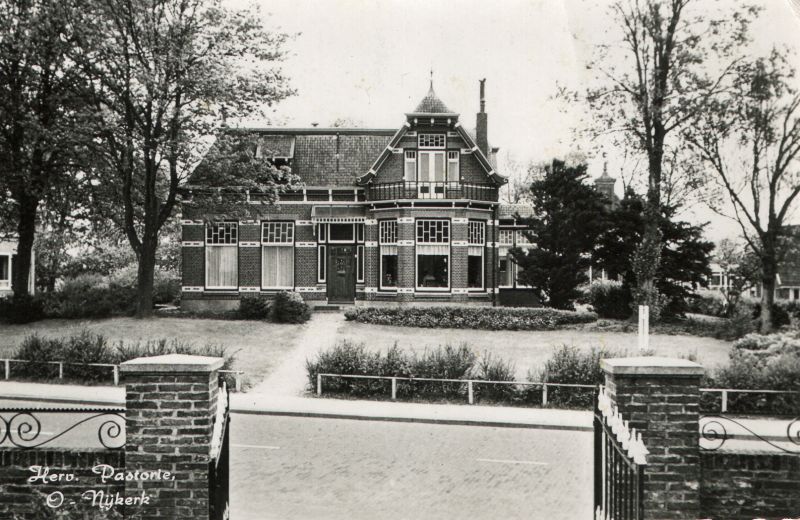 De tuin van de pastorie staat nog vol struiken, de twee prachtige hoge bomen van nu zijn nog niet goed herkenbaar. De Rabobank was er nog niet (gebouwd in 1957) dus was de pastorietuin veel groter, ook de prachtige rode beuk (echt een ‘monumentale’ boom die het behouden waard is!) stond nog op het terrein van de pastorie.