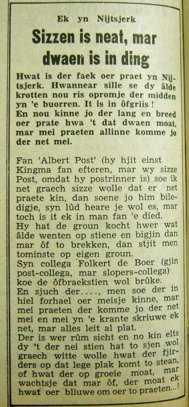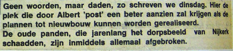 Drie dagen later, op 14 juni 1974, stond de tweede foto in de krant, de begeleidende tekst heeft het over ‘plannen tot nieuwbouw’. En inderdaad op 4 september 1974 werd de eerste steen gelegd voor een woonhuis met postkantoor voor Albert Kingma. Tot 1989 zou dat postkantoor dienst doen.