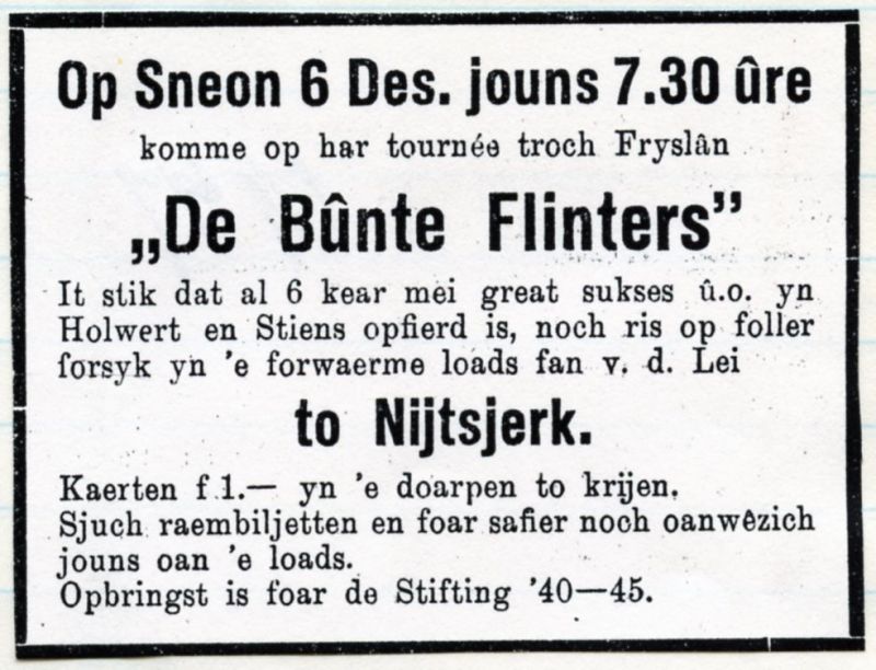 In de jaren ’80 van de vorige eeuw nam de toneelploeg van Easternijtsjerk de naam ‘De Bûnte Flinters’ aan en in 1991 tijdens de eerste dorpsreünie is de oorspronkelijke voorstelling nog eens opgevoerd.