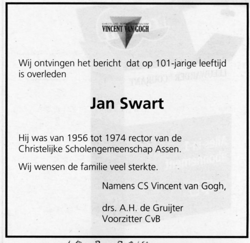*Jan Swart slaagde erin zijn familienaam Zwart officieel te laten veranderen in Swart op basis van familieonderzoek waaruit bleek dat de oudst bekende familieleden zich ook Swart met een S noemden.