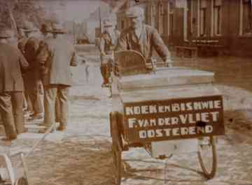 Zelf heb ik toen ik met 14 jaar van school kwam, ook geholpen met venten, als oudste van het gezin moest ik helpen. Te voet van Easterein naar Itens, dan via Hinnaard naar Easterlittens, door naar Baard en Winsum en via Spannum en Wommels weer naar huis. Daarna was ik doodmoe, kan ik je vertellen. Meestal moest ik dan zaterdags nog grote bestellingen van twee koeken, zeven cent elk, naar een boer brengen die ver buiten het dorp woonde. Je had maar te gaan, zin of geen zin: voor 14 cent dat hele stuk lopen. Heit verdiende er misschien twee cent mee. Ik denk niet dat je de huidige jeugd zo gek krijgt.