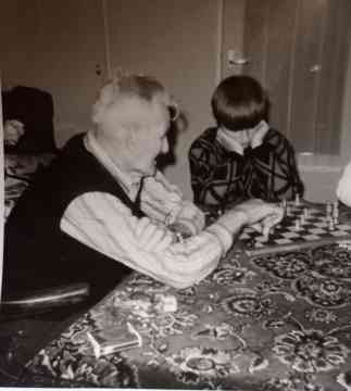 Foto  pake Fokke schaakt met Anne, Albert (12 jr) kijkt toe