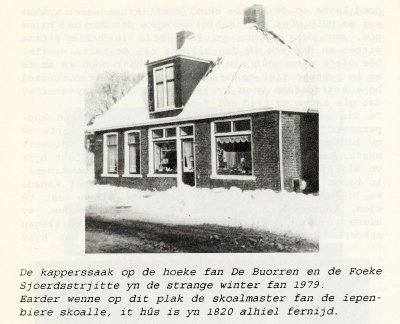 Jabik Kingma vroeg toen 55 cent voor het knippen, maar ik ben met 65 cent begonnen. Het scheren kostte een kwartje. Een fooi was toen geen gebruik. Je kon er van alles aan doen, lekker ruiken en zo, maar de mensen gaven wat het koste, niets meer. Dat hoefde natuurlijk ook niet, maar een extra verdienste was er dus niet bij. Wybren de Vries, zoon van Eibert “slachter” was “ynsjipper” bij ons, in het begin hele dagen, hij deed de scheerzeep op en dan scheerde ik, terwijl hij de volgende weer zeepte. Als ik klaar was, spuitte hij de klant af, hielp ze in de jas en zeepte weer de volgende. Dat ging soms hele dagen zo. Als het druk was, zat het hier smoorvol. De lange banken zaten vol en soms moesten er nog stoelen bij gezet worden. Dat heeft ook wel eens klanten gekost, want dan vertrokken ze als ze dit zagen.