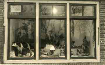 Slager Holwerda (aan de Ropsterwei) laat in de etalage zien wat hij te koop heeft – een koe en een varken, een rollade en runderlapjes – terwijl in de hoek een haas figureert (is het een Paashaas?).