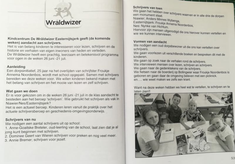 Het is van belang kinderen te interesseren voor lezen, schrijven en de historie en verhalen van eigen inwoners van heden en verleden. De Wrâldwizer heeft een prachtig leerzaam en betekenisvol programma voor ogen in de weken 26 juni -21 juli.