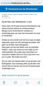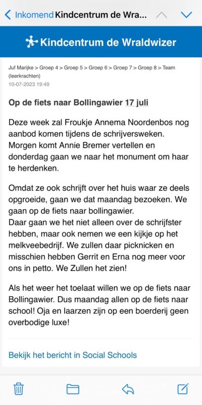 Froukje Annema Noordenbos overleed 25 jaar geleden, groeide op in Berchhuzen waar ze ook over schreef. Daarnaast was er aandacht voor schrijvers uit Oosternijkerk, Niawier en Nes. Annie Bremer kwam hier op school over vertellen. Aan het einde van ons project zijn groep 4-8 op de fiets naar Bollingwier geweest om de boerderij van dichtbij te bewonderen. Hier hebben we gepicknickt en geleerd over het boerenbedrijf.