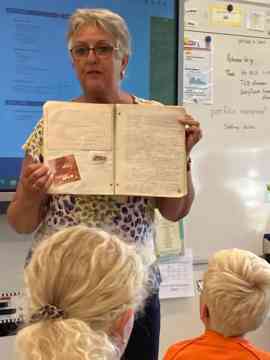 We spraken ook over de boeken die Reinder Tolsma schreef (oud meester van de Foeke Sjoerdsskoalle) en een aantal leerlingen mochten van Jappie Poutsma een boek vasthouden en inkijken van Foeke Sjoerds, een heel oud boek.