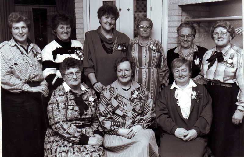 Dit is een wat “jongere” foto dan de gebruikelijke zwart-wit foto’s van voor de Wereldoorlog, ook al is het bestaan van de hervormde vrouwenvereniging zelf intussen ook al geschiedenis geworden. Op de meeste oudere foto’s zijn grote aantallen personen aanwezig, zo niet bij deze. Het zijn dan ook zo’n beetje ‘de laatsten der Mohikanen’ van de vereniging. De dames staan hier nog wel behoorlijk trots op de foto, geplaatst in de Nieuwe Dockumer Courant van 21 december 1987, nu 26 jaar geleden. Deze vrouwenvereniging bestaat niet meer, ook de gereformeerde evenknie, is opgeheven. Zelfs de veel later opgerichte (1956?) Vrouwenbond is al ter ziele.