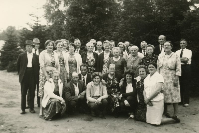 Deze foto toont een gevarieerd gezelschap, zowel vrouwen als mannen. Je zou het zo kunnen zeggen: de hervormde vrouwenvereniging “Wees een Zegen” ging op reis en de mannen mochten ook mee. Een datum is niet bekend maar zal rond 1970 liggen. Omdat de opstelling niet in duidelijke rijen is, ga ik hier uit van twee rijen: vooraan op hurken en een rij staande mensen waarbij een enkeling vrijwel niet te zien is. Alleen de familienaam van de man is gebruikt.
